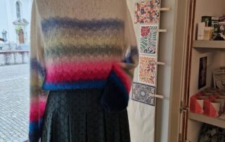Handgestrickter Pullover im Atelier erhältlich, in den Farben: Violette, Rot, Flaschengrün und Kirschrot