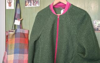 Handgestrickter Pullover im Atelier erhältlich, in den Farben: Violette, Rot, Flaschengrün und Kirschrot